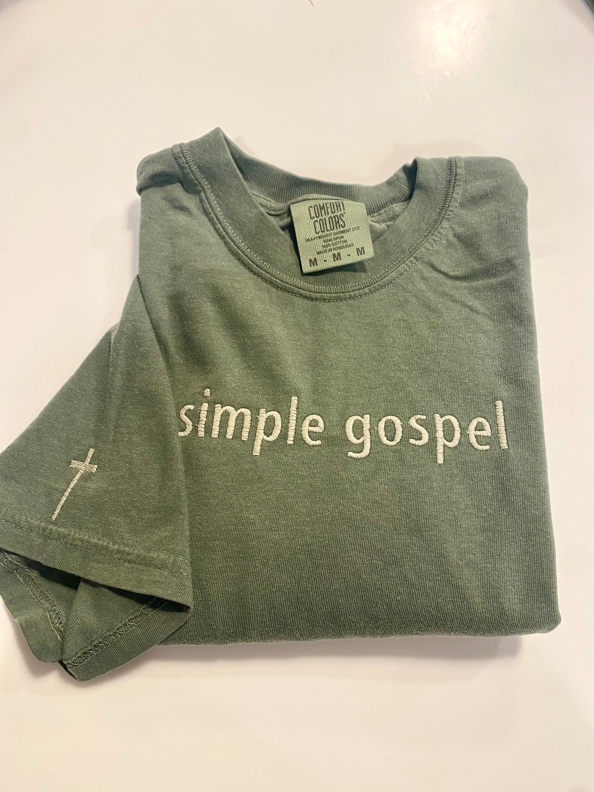 Simple gospel shirt sleeve embroidered t shirt with cross embroidered on sleeve -green